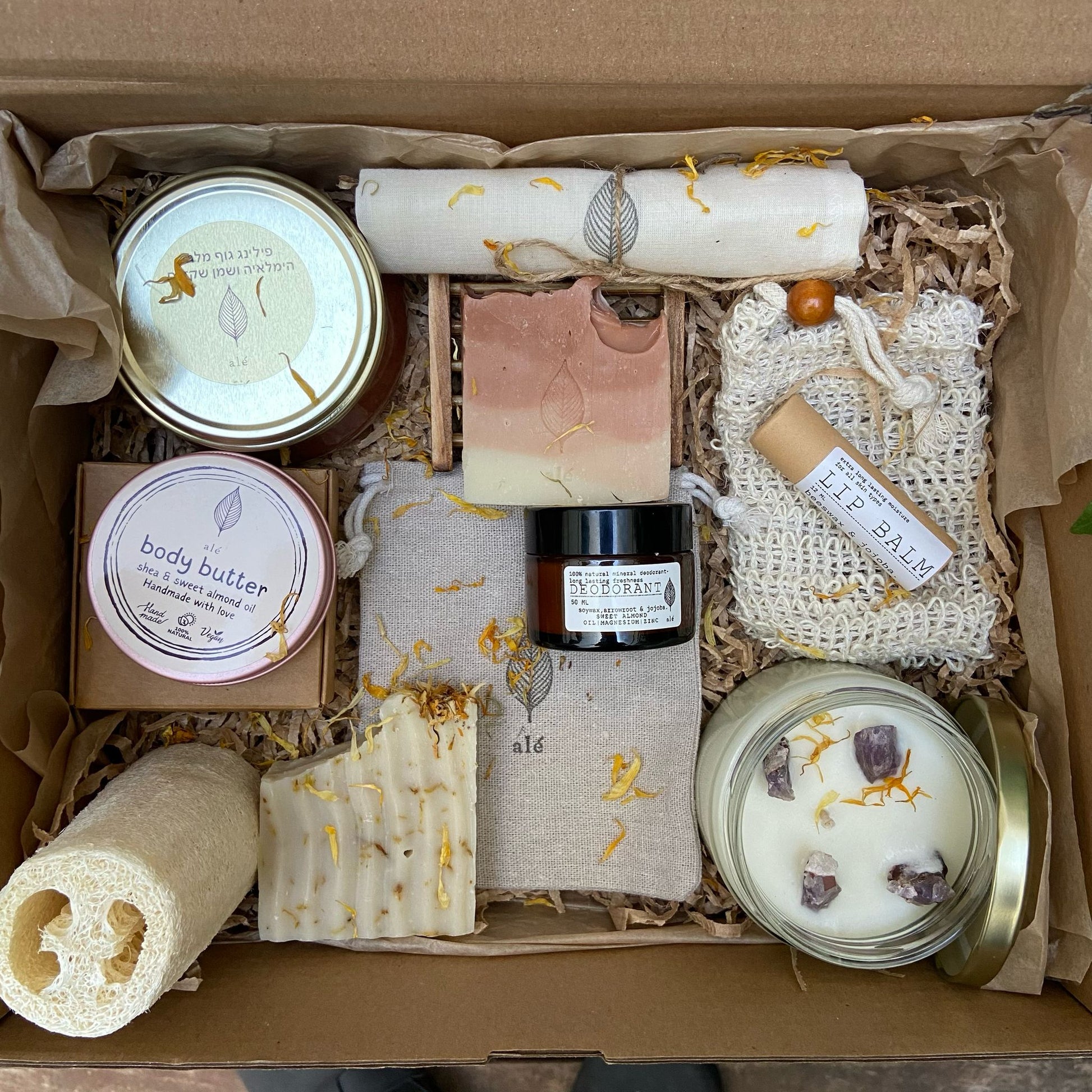 במארז תוכלו למצוא: נר ארומתרפי, חמאת גוף, פילינג גוף, דאודורנט מינרלי טבעי, סבון  + סבונייה מעץ, שפתון לחות, ותיק בד קטן