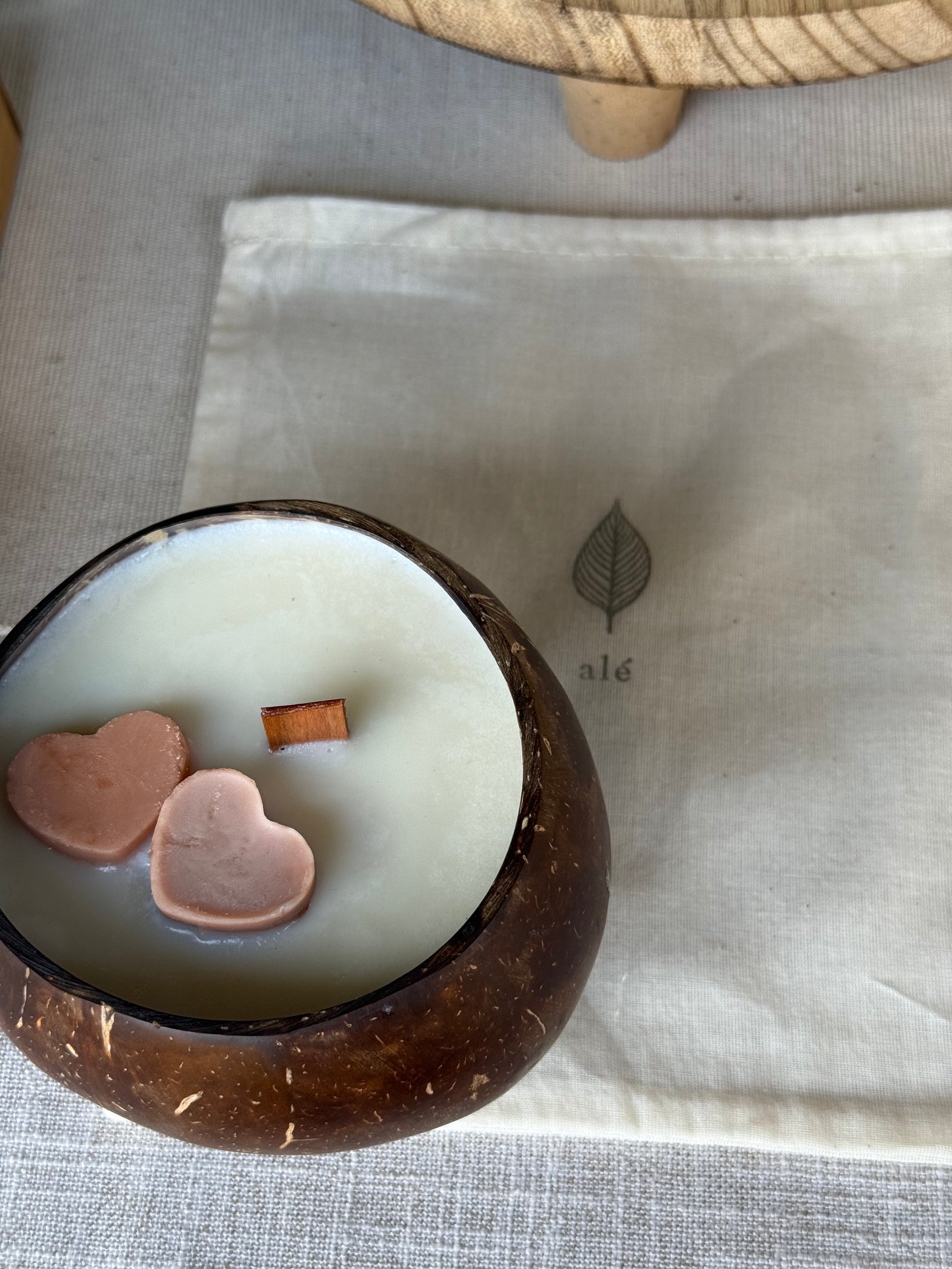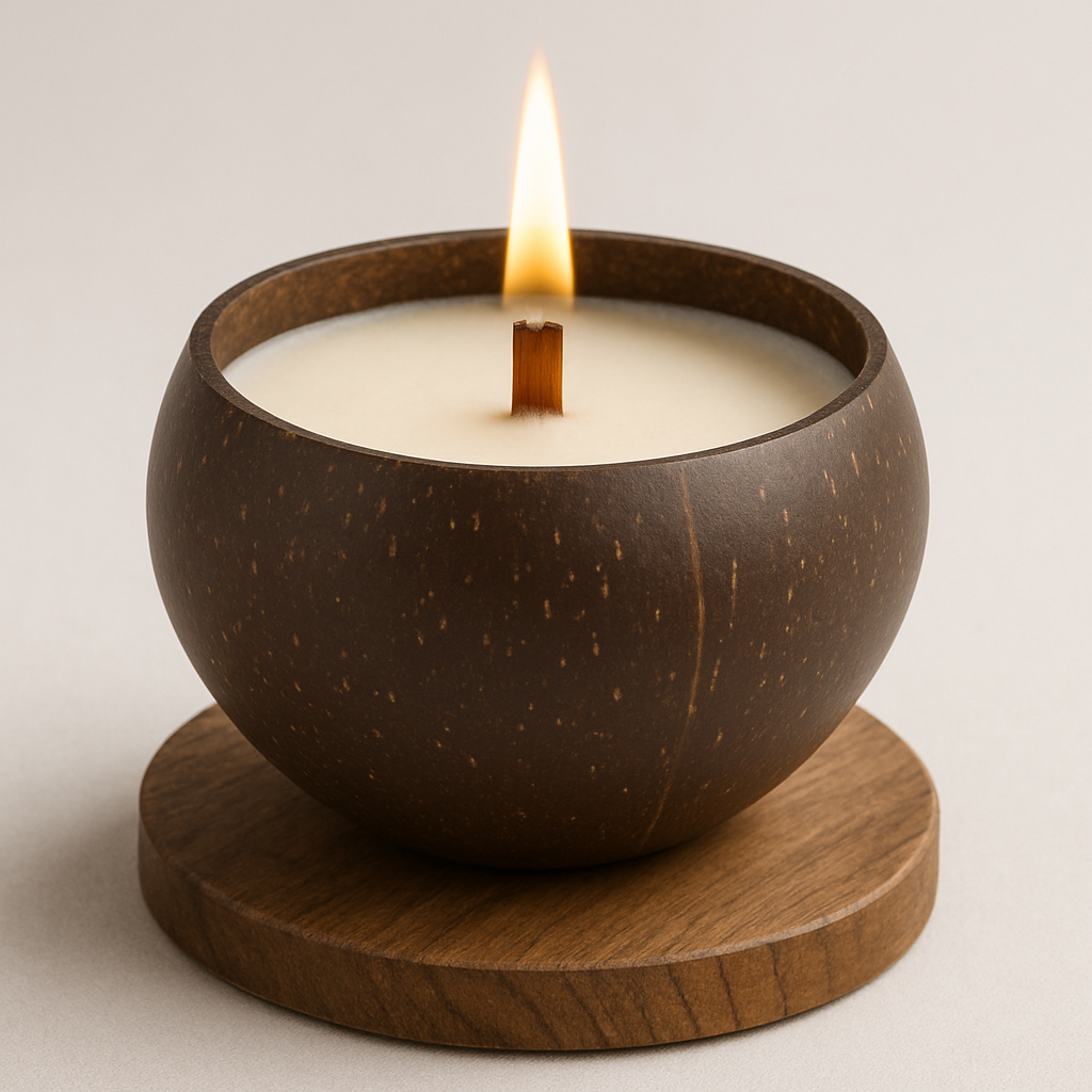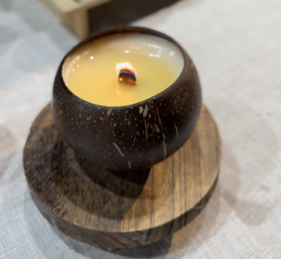 נר עשוי שעווה צמחית (שעוות סויה+קוקוס) בכלי קוקוס טבעי, בניחוח שמנים אתריים טהורים